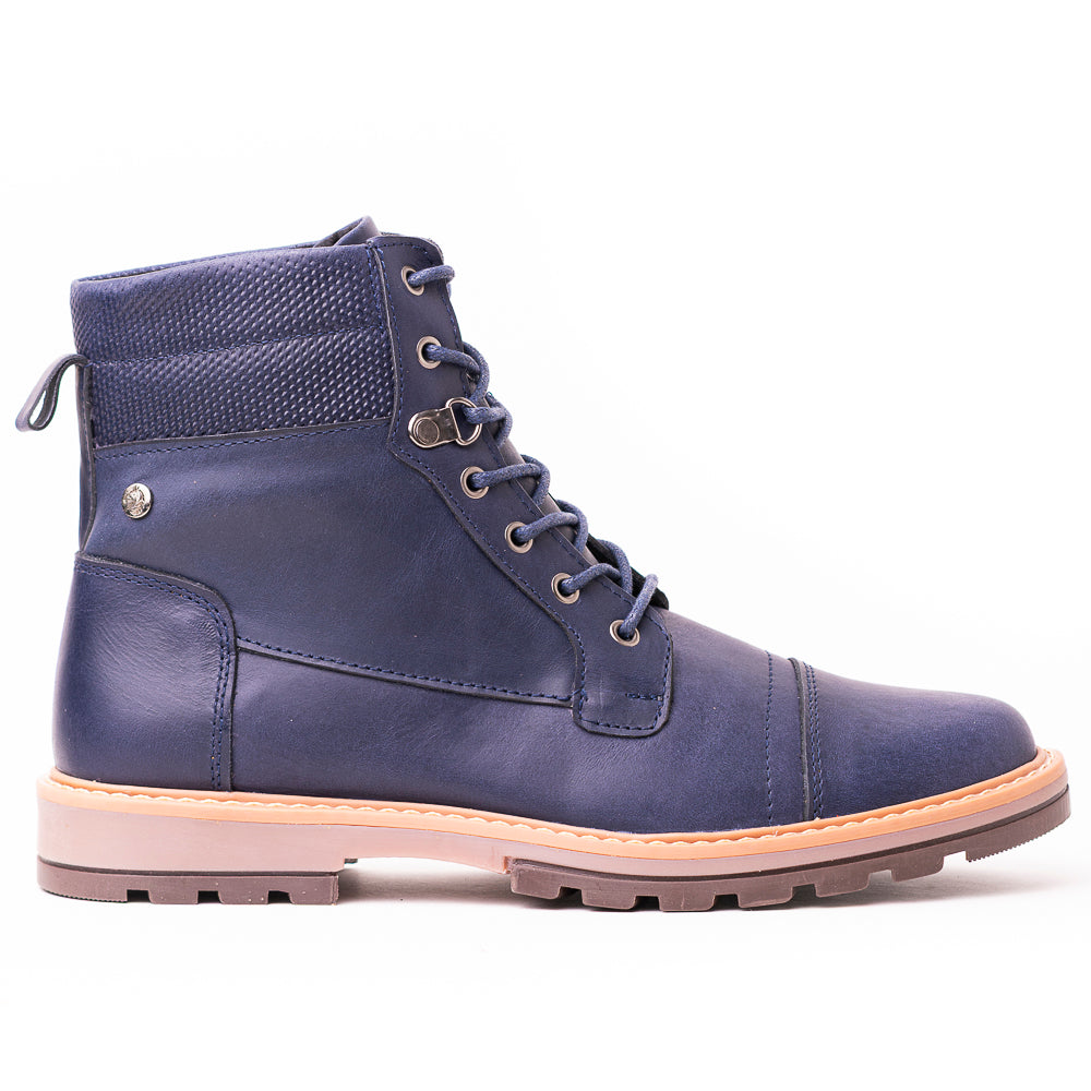 Esta bota de cuero para hombre destaca por su dise–o robusto y estilizado, ideal para quienes buscan presencia y funcionalidad. Confeccionada en cuero azul oscuro, presenta una combinaci—n de texturas entre el cuerpo liso y detalles en relieve alrededor del tobillo, lo que le aporta un aire moderno sin perder su car‡cter cl‡sico. Sus cordones a tono pasan por ojales met‡licos plateados que refuerzan el ajuste y el estilo. La suela de goma en tono beige con dise–o antideslizante brinda excelente tracci—n y contraste visual, permitiendo caminar con seguridad en distintas superficies.