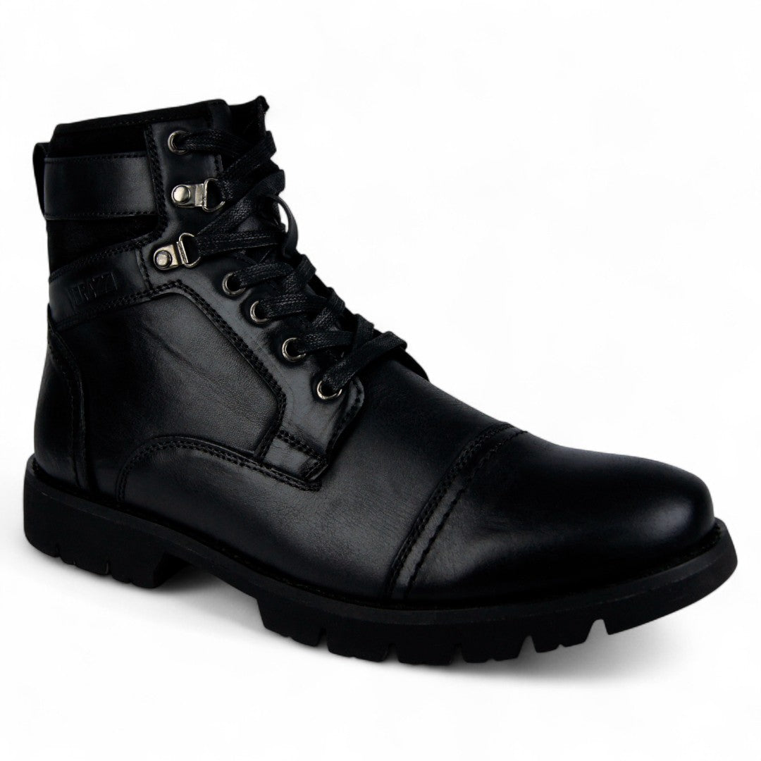 Esta bota para hombre ofrece protección, estabilidad y estilo en un diseño pensado para exigencias laborales y uso rudo. Confeccionada en cuero negro, incorpora una estructura de caña media con cierre de velcro superior que refuerza el ajuste en el tobillo, complementado por cordones gruesos y ojales metálicos resistentes. Su construcción robusta incluye una suela con patrón antideslizante ideal para desplazamientos en superficies irregulares o húmedas. Los detalles metálicos y acabados mates le dan una apariencia moderna, funcional y sobria.