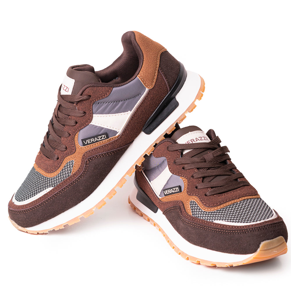 Este tenis urbano para hombre de la marca Verazzi destaca por su diseño moderno y equilibrado, ideal para quienes buscan estilo y comodidad en un solo calzado. El color principal es café, presente en la base de la capellada y la media suela, mientras que los colores secundarios incluyen gris, café, y gamuza marrón en el talón, creando una paleta neutra con acentos cálidos. El distintivo gráfico lateral en forma de “X” en tono mostaza aporta un toque visual audaz y contemporáneo.