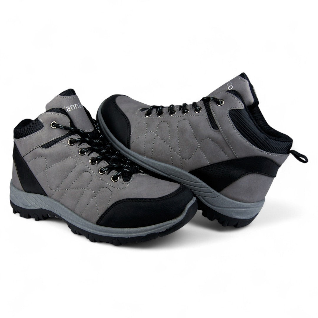 Esta bota para hombre está diseñada para ofrecer máxima protección y rendimiento en ambientes laborales exigentes y terrenos difíciles. Confeccionada en tono gris con refuerzos en negro en punta y talón, cuenta con una estructura acolchada y robusta que resguarda el pie frente a impactos, fricción y condiciones climáticas adversas. Los cordones gruesos negros, junto con los ojales metálicos, garantizan un ajuste firme, mientras que la suela de goma con patrón profundo proporciona excelente tracción, ideal para superficies irregulares o húmedas.