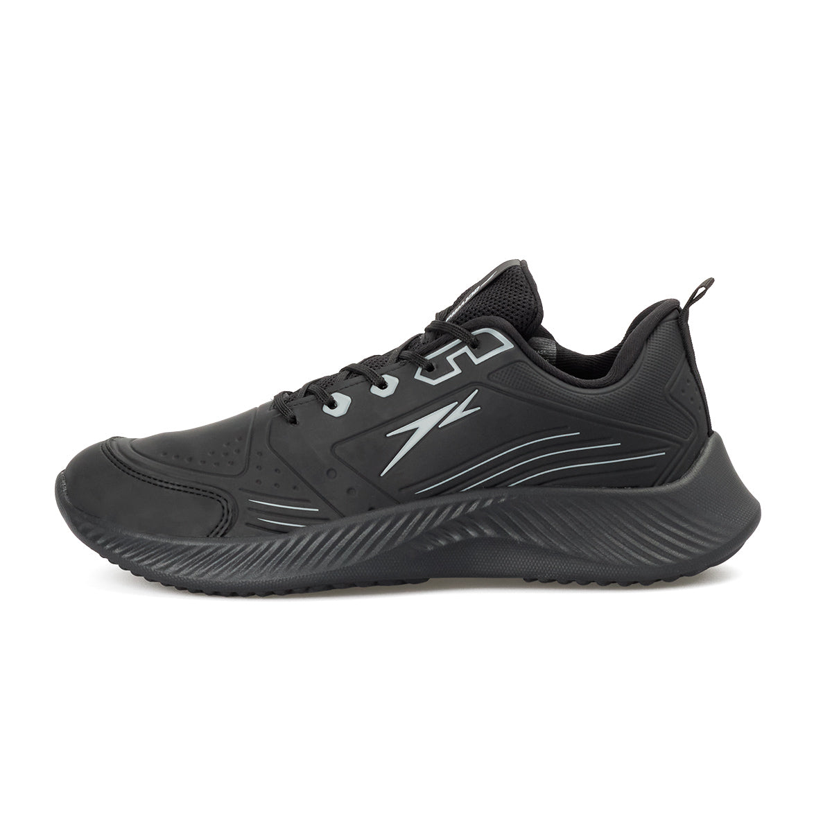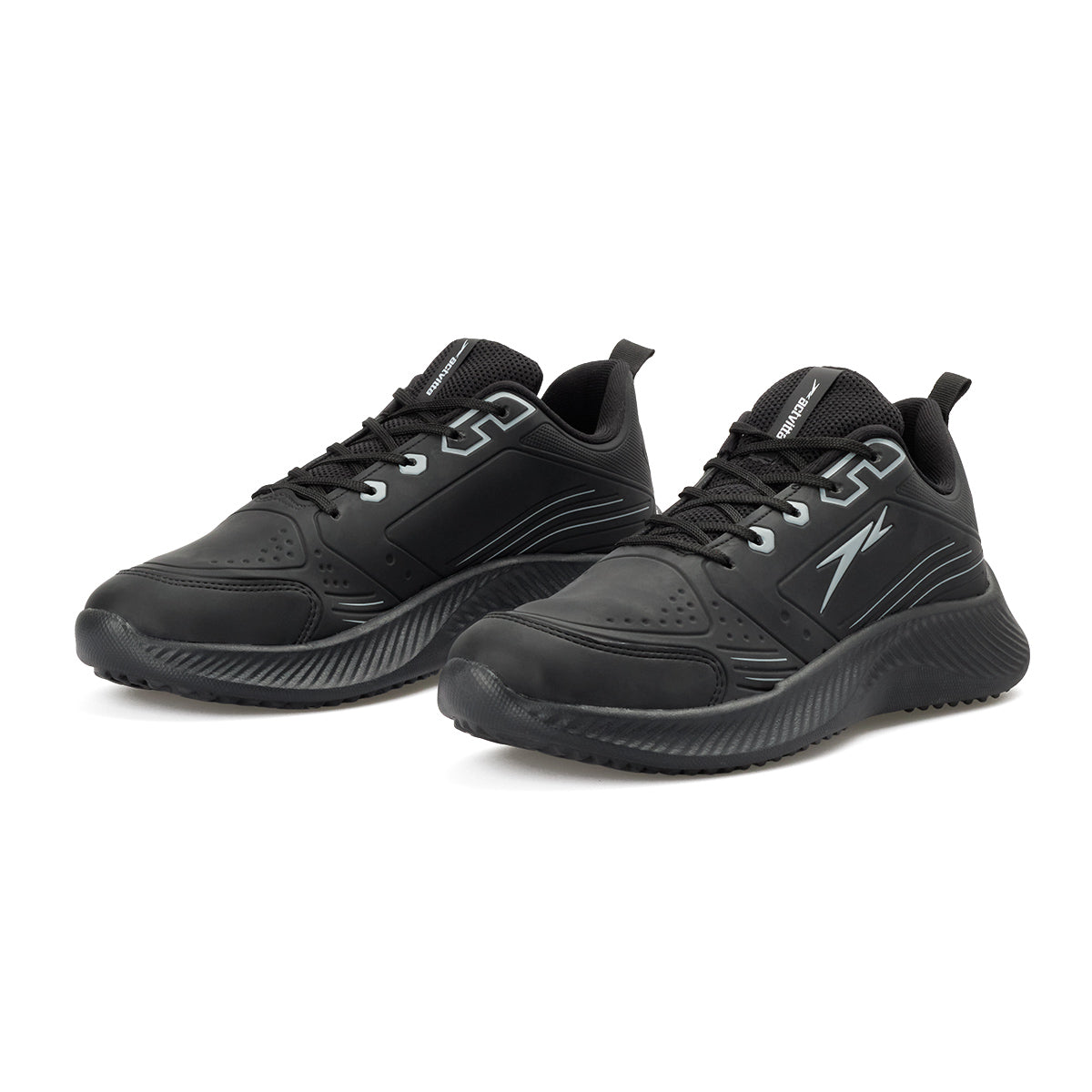 Este tenis deportivo para hombre fusiona diseño moderno y funcionalidad en una propuesta versátil para el día a día. Confeccionado en color negro con detalles en gris y logotipo blanco, su capellada sintética con perforaciones frontales permite una adecuada ventilación, manteniendo frescura en el pie durante usos prolongados. El sistema de cordones negros con ojales reforzados asegura un ajuste firme y cómodo, mientras que la lengüeta trasera facilita el calce. La suela blanca de buen grosor, con patrón antideslizante, garantiza estabilidad y amortiguación en desplazamientos urbanos o deportivos.